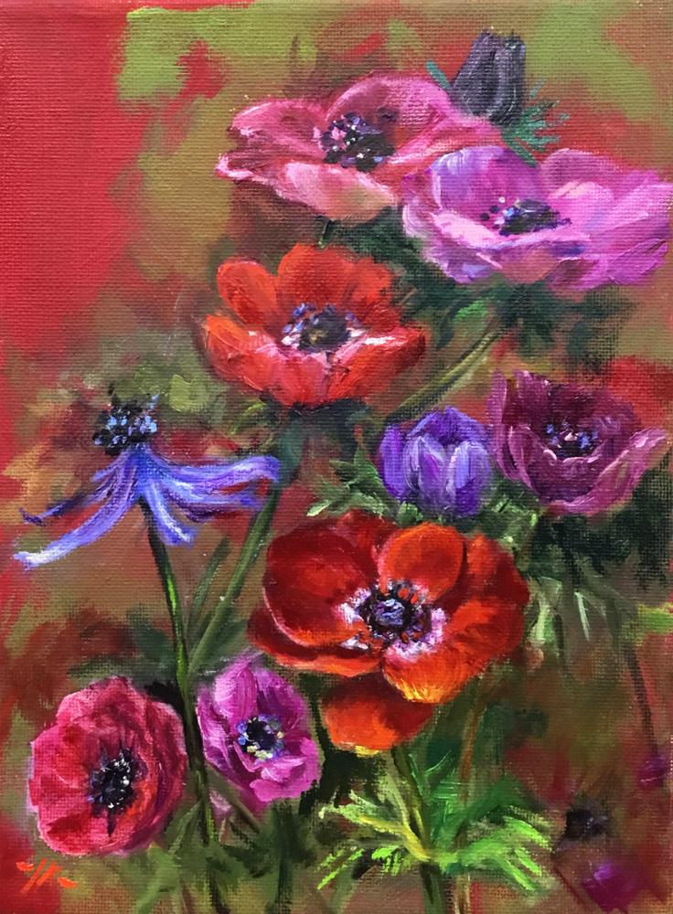 Olieverf-anemonen-op-linnen-maat-13x18-cm te koop met of zonder lijstje